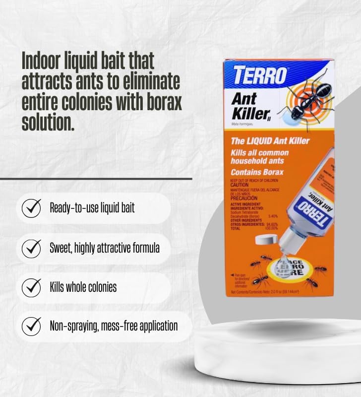 TERRO Ant Killer Liquid is an effective solution for managing indoor ant infestations. This ready-to-use liquid comes in a 2 oz container and acts as a bait that attracts ants. Once the ants consume the liquid, they carry it back to their colony, providing long-term control. The formula is designed to target common household ants, helping to reduce their numbers effectively. The ant bait traps indoor is easy to apply and works without the need for mixing. Simply place the bait on a cardboard tile, and position it in areas where ants are frequently seen. The bait is designed to be safe for use around children and pets when applied as directed, making it suitable for households with family members and pets. This gift set includes 1x TERRO Ant Killer Liquid 2 oz and 1x Board Trap. The Board Trap helps to monitor and manage ant populations effectively, making it a great addition to your ant control strategy. The set is packaged for convenience and is ready for immediate use. Whether you're dealing with an ant issue in your kitchen or any other indoor space, this set provides an easy-to-use solution for reducing and managing ant populations. With its simple application and practical design, this gift set makes it easy to keep your home free of ants.