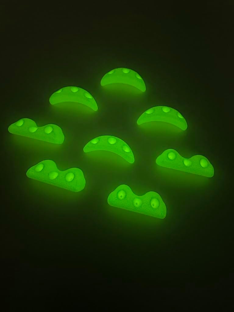 8 SCREW ON GLOW in the DARK rock climbing holds for kids. This set screws directly into your plywood climbing wall. It does not require bolts or T-Nuts. Screw-ons allow for easier moving of holds around your wall. Please make sure you are looking for screw on climbing holds before placing your order. 8 screw on glow in the dark rock climbing holds for kids. Postive holds with kid friendly texture. Light weight ABS material. Screws not included. Use standard #8 construction screws.