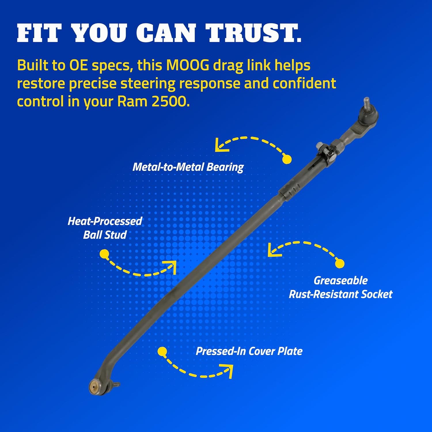 Upgrade your vehicle’s performance and reliability with the DRiV MOOG Front/Rear Suspension Stabilizer Bar Link, an engineered steering upgrade designed to meet the highest standards for modern trucks. This precision fit steering part is compatible with Ram 2500 and Ram 3500 models, making it a dependable choice for drivers who demand outstanding handling and stability. As a heavy duty steering part, it is built to restore like-new steering feel and motion, giving your suspension the reliable motion support it needs for long-term durability and safety on the road. The MOOG Stabilizer Bar Link stands out with its robust construction and advanced design features. The heat treated ball stud and metal bearing support deliver improved fatigue strength, ensuring the link can withstand the toughest driving conditions without premature wear or failure. Its greaseable steering joint and maintenance-ready socket allow for easy lubrication, flushing out debris and inhibiting rust and wear over time. The impact absorbing link, combined with a tight bearing structure and pressed cover plate seal, keeps the bearing package secure, minimizes looseness, and seals out harmful contaminants that can degrade performance. This durable steering connector is crafted for a seamless fit, supporting fast, hassle-free installation and precise steering alignment right out of the box. As one of the world’s leading designers, manufacturers, and marketers of automotive products for aftermarket customers, what DRiV makes matters. How we show up and compete in the marketplace matters. Our business performance matters. But the thing that matters most is what we stand for together—what we value. Our values include Radical Candor, Simplify, Organizational Velocity, Tenacious Execution, and Win. With a dependable history, you can count on DRiV to deliver what matters.