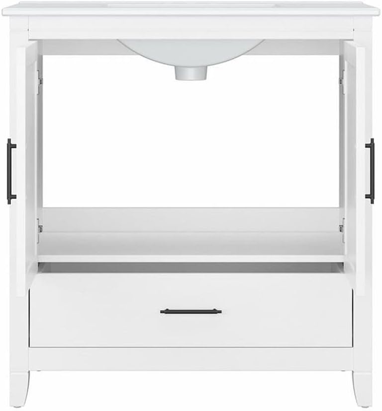The Pemberly Row 32W bathroom vanity with sink is a perfect way to outfit your home in authentic farmhouse style. Featuring a refreshingly casual design, this wall-mounted vanity combines impressive looks with the durability and convenience needed for years of trouble-free use. The white ceramic sink has three pre-drilled holes for a 4-inch centerset faucet (fixtures not included) along with an overflow hole and a 1.75-inch drain. Take advantage of a built-in drawer and storage cabinet to keep cleaning supplies, towels, toiletries and other personal care items organized and accessible. Backed by 1 year manufacturer's warranty, this small bathroom sink cabinet has been rigorously tested for safety, durability and performance while the drop-in sink basin meets UPC and CSA B45.1 certification standards for ceramic plumbing fixtures. User assembly and installation is required.Features:- Material: Engineered wood, laminates, ceramic basin, metal- Finish: White ash- Rectangular sink basin features three pre-drilled holes for a 4-inch centerset faucet (not included)- Overflow hole improves sink drainage while helping to prevent water from spilling over the edge- Vanity includes a drawer and 2 door storage cabinet for organizing toiletries, cleaning supplies and more- Doors feature unique X pattern accents that add to 's easy going style- Available in your choice of driftwood gray and white ash finish options- Drop-in sink basin meets UPC and CSA B45.1 certification standards for ceramic plumbing fixtures- Backed by 1 year manufacturer's warranty- See 's full line of coordinating farmhouse bathroom storage furniture- Bundle includes: 32W bathroom vanity cabinet, 32W drop-in bathroom sink basin, bathroom medicine cabinet with mirror, over the toilet storage cabinet- Bathroom vanity with sink is wall mountedSpecifications:- Product Dimensions: 34.06" H x 31.89" W x 18.31" D- Product Weight: 97.85 lbs- Assembly Required: Yes- Product Dimensions: (Drop in basin) 6.69" H x 31.89" W x 18.31" D- Product Dimensions: (Vanity) 33.39" H x 30.71" W x 17.13" D- Product Dimensions: (Bathroom vanity with sink) 34" H x 32" W x 18" D