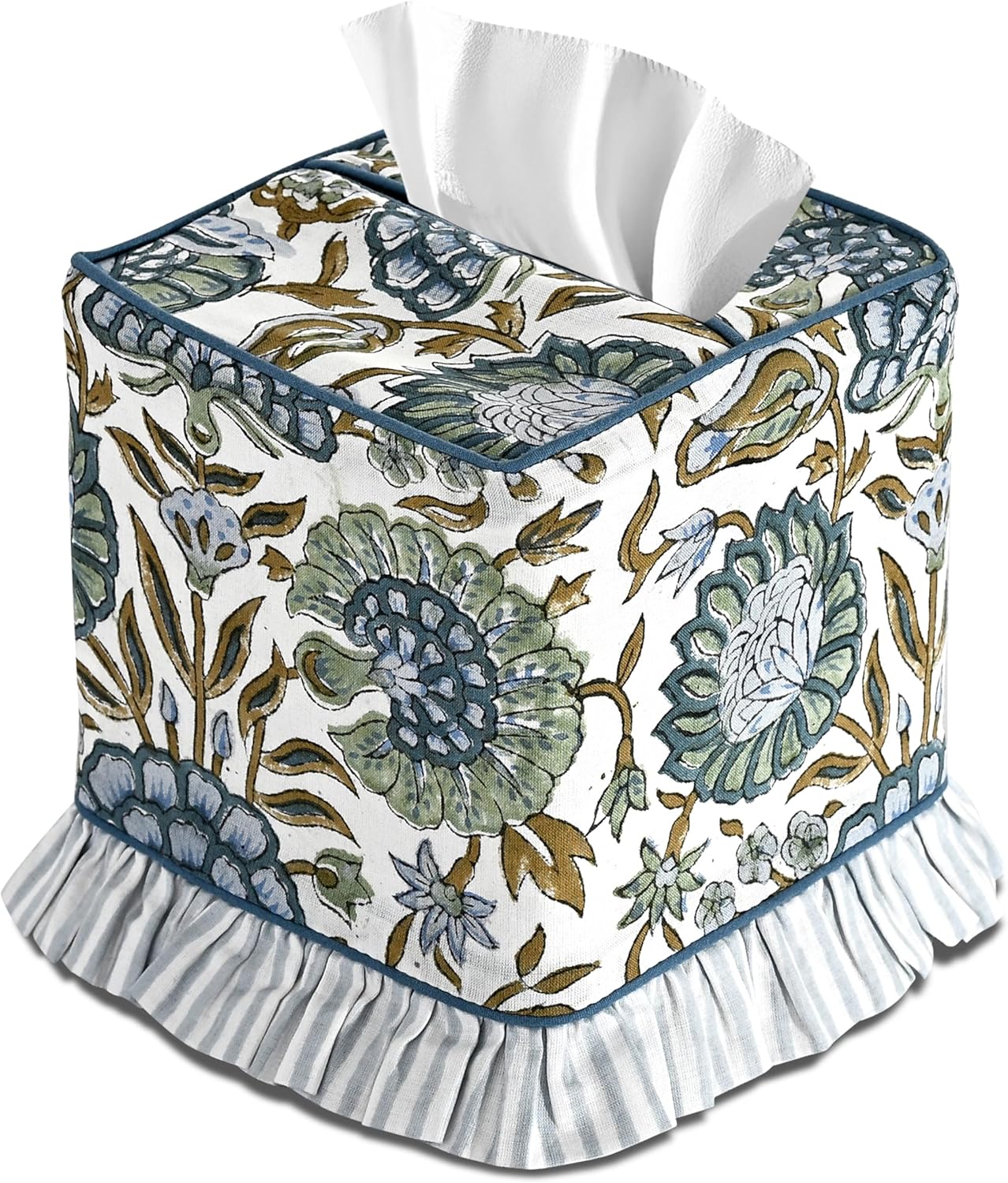 Transform your everyday essentials into elevated home Decor with the Ridhi Block Print Ruffle Tissue Box Cover. Thoughtfully handcrafted by skilled artisans, each piece showcases traditional block-printing techniques passed down through generations. The detailed patterns, soft color palettes, and meticulous craftsmanship create a timeless look that enhances any room with understated luxury. Made from 100% premium cotton, the fabric offers a smooth, breathable feel and drapes effortlessly over the tissue box, bringing warmth, texture, and an artisan touch to your Decor.Designed with a refined ruffle trim, this cover blends softness and sophistication, making it a beautiful accent for modern, cottage, farmhouse, boho, or vintage-inspired Decor. The tailored construction fits most standard square tissue boxes and slips on easily, instantly transforming plain cardboard packaging into a decorative element worthy of display. Whether placed on a nightstand, vanity counter, bathroom shelf, office desk, guest room dresser, or living room side table, it adds a curated, boutique-style finish to your Decor.Beyond its visual appeal, the Ridhi Tissue Box Cover makes a thoughtful and memorable gift. Its handcrafted quality and elegant design suit a variety of occasions—from housewarmings and birthdays to weddings, Mother’s Day, Christmas, Thanksgiving, Easter, and other cherished U.S. celebrations. Each piece is made with care, offering a blend of artful detail and everyday functionality that enriches the ambience of any home.Bring beauty to the small moments and elevate the spaces you use most with this premium, hand-printed fabric tissue box cover—where artistry and practicality meet to create exceptional home Decor.
